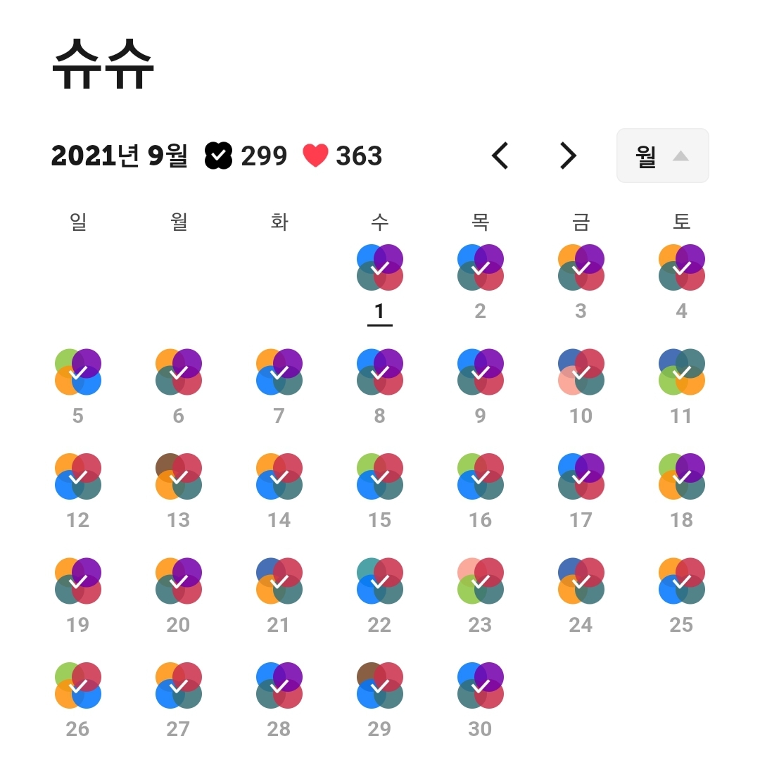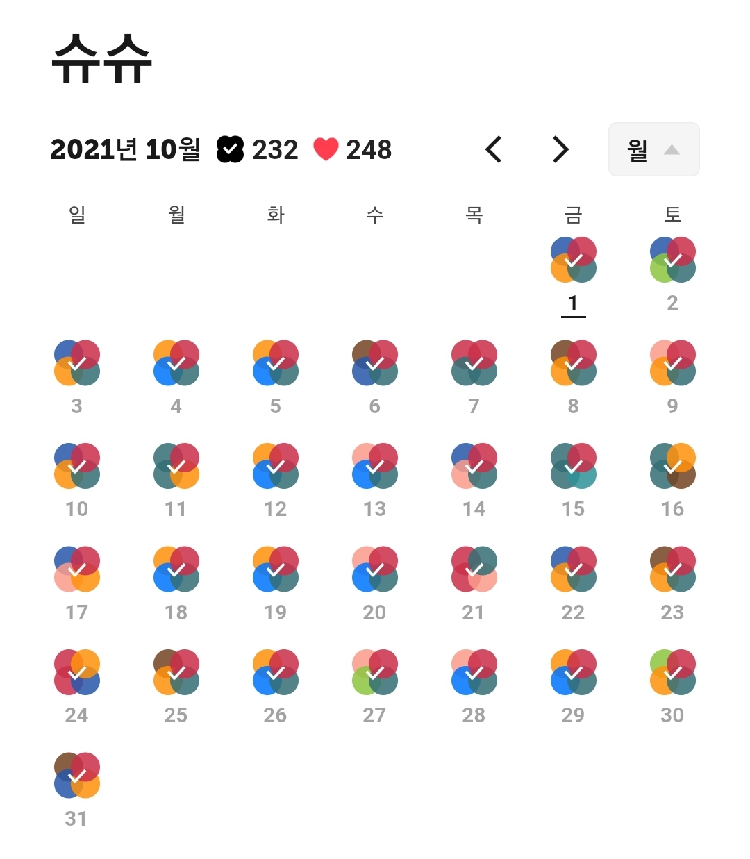 그러다 문득 일주일 중 단 하루도 온전히 쉬는 날이 없다는 것을 발견했다. 대학원생이니까 당연한 일이라고 한다면 할 말은 없긴 한데... 여름방학 때도 투고 준비를 한다고, 또 스터디를 한다고 뭘 계속 했다는 점을 고려해 보면 나는 입학 이래로 단 하루도 대학원 또는 공부와 무관한 날을 보낸 적이 없는 것이다. 8월 후반부터 투두메이트 앱을 사용하기 시작했는데 9월과 10월을 보니 정말 모든 날에 알록달록하게 할 일을 마쳤다는 체크가 되어 있었다. 오히려 회사를 다닐 땐 비록 아주 불규칙했지만 휴가도 있었고 휴일도 있었는데. 하루에 내가 마음대로 쓸 수 있는 시간은 더 늘어났지만, 전체적으로 봤을 땐 어쩌면 일을 할 때보다 더 바쁘게 살고 있는 것 같기도 하다.