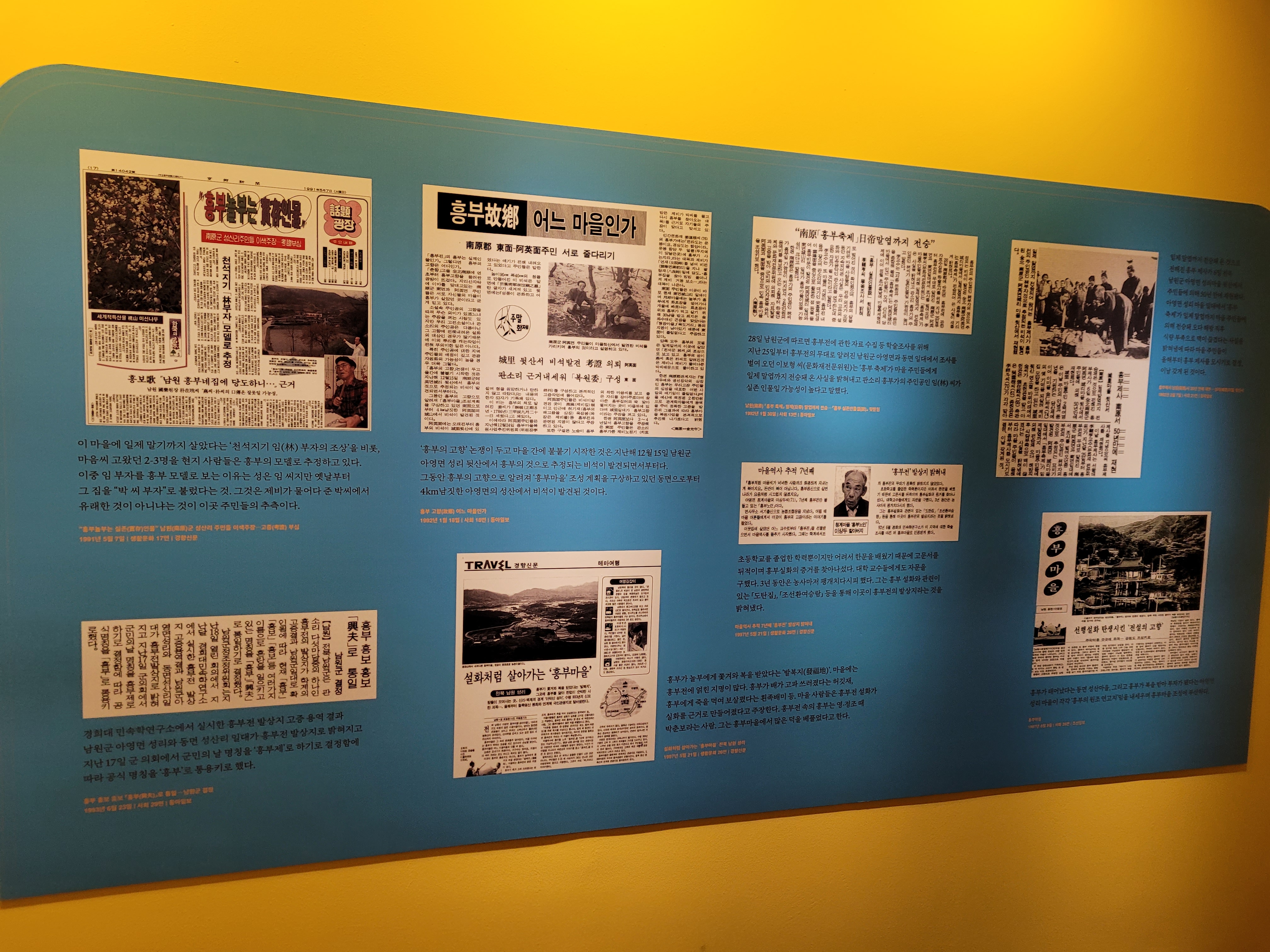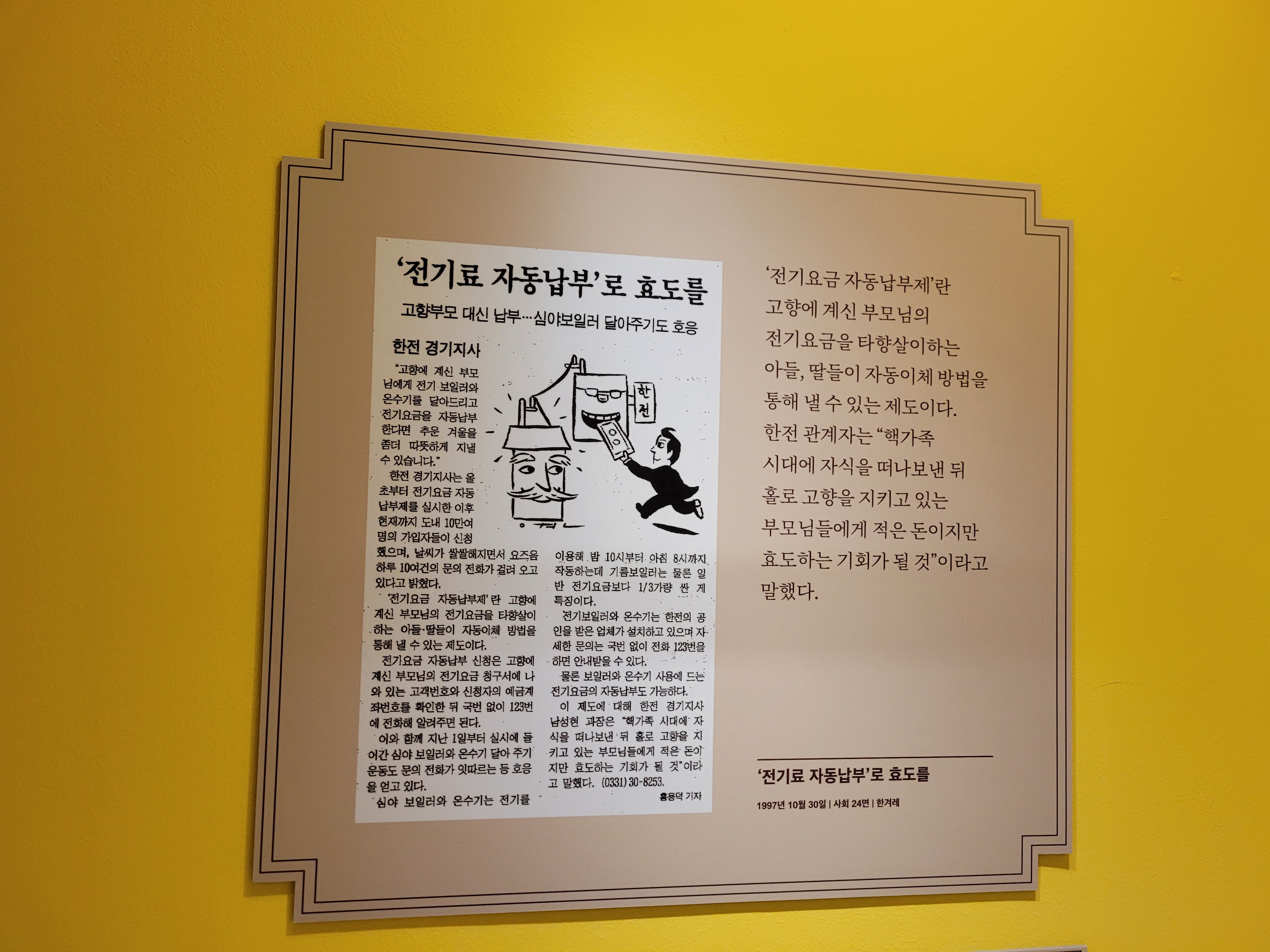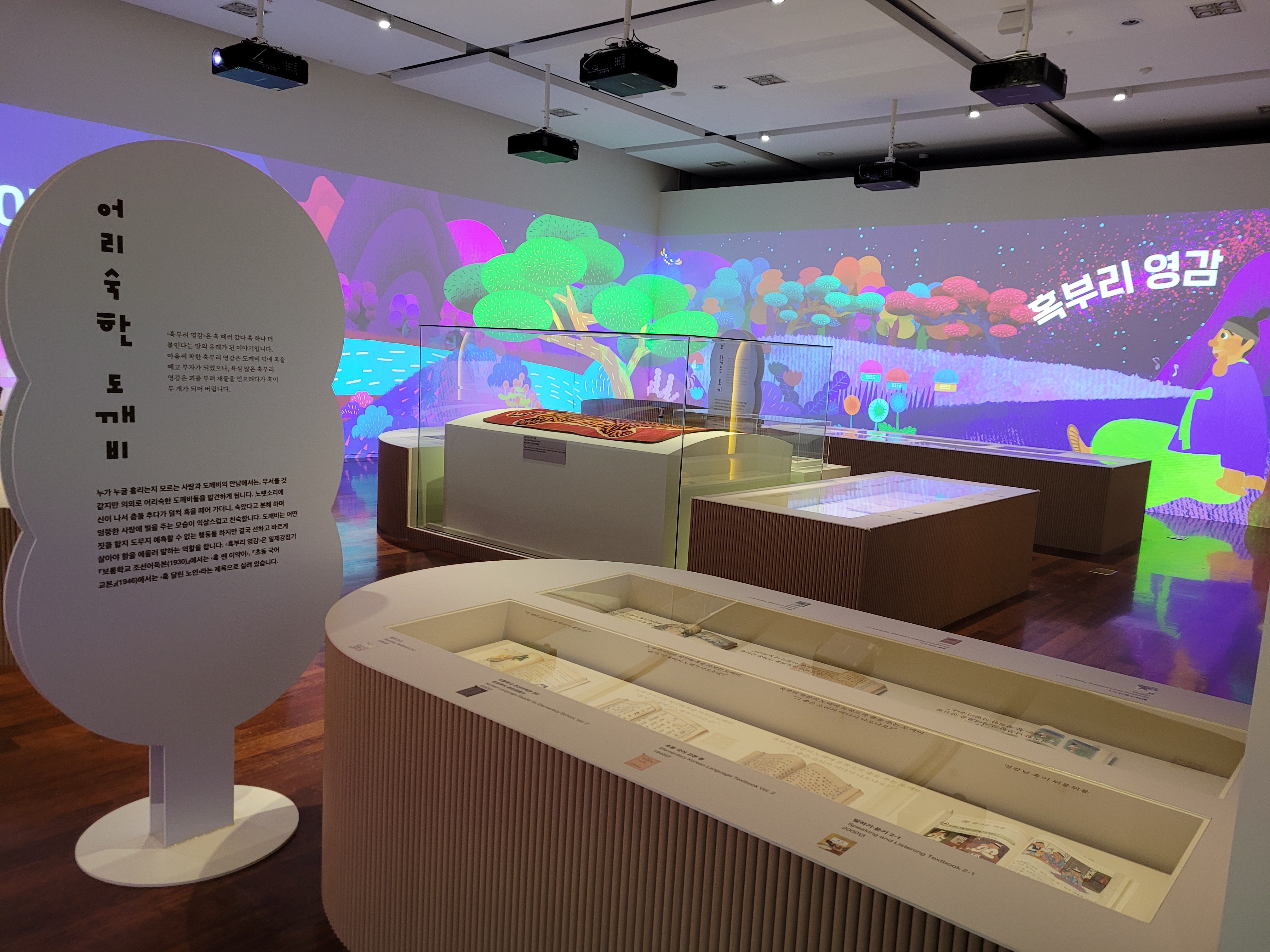 막연히 동화 관련 내용만 있겠거니 했는데 생각보다도 더 문화론 수업에 적절한 내용의 전시였다. 각기 다른 교육 과정에서 편찬되었던 초등학교 국어 교과서들에 나온 동화와, 그 동화의 근간이 되는 옛 문헌 속 설화들, 그리고 그 이야기들에서 확인할 수 있는 한국 문화 요소가 실제 사회에 반영되어 나타난 사례들이 연결되어 있었다. '더불어 사는' 사람들의 모습, 효도와 우애, 도깨비나 산신령과 같은 상상 속의 존재들, 까치, 호랑이, 토끼, 뱀 등 한국인들에게 친근한 동물들 등을 테마로 전시가 구성되어 있었다. 곳곳에는 옛이야기들을 말로 전하는 사람들의 목소리를 들을 수 있는 수화기가 마련되어 있었고, 관련된 공연 영상 자료도 여러 개 볼 수 있었다.