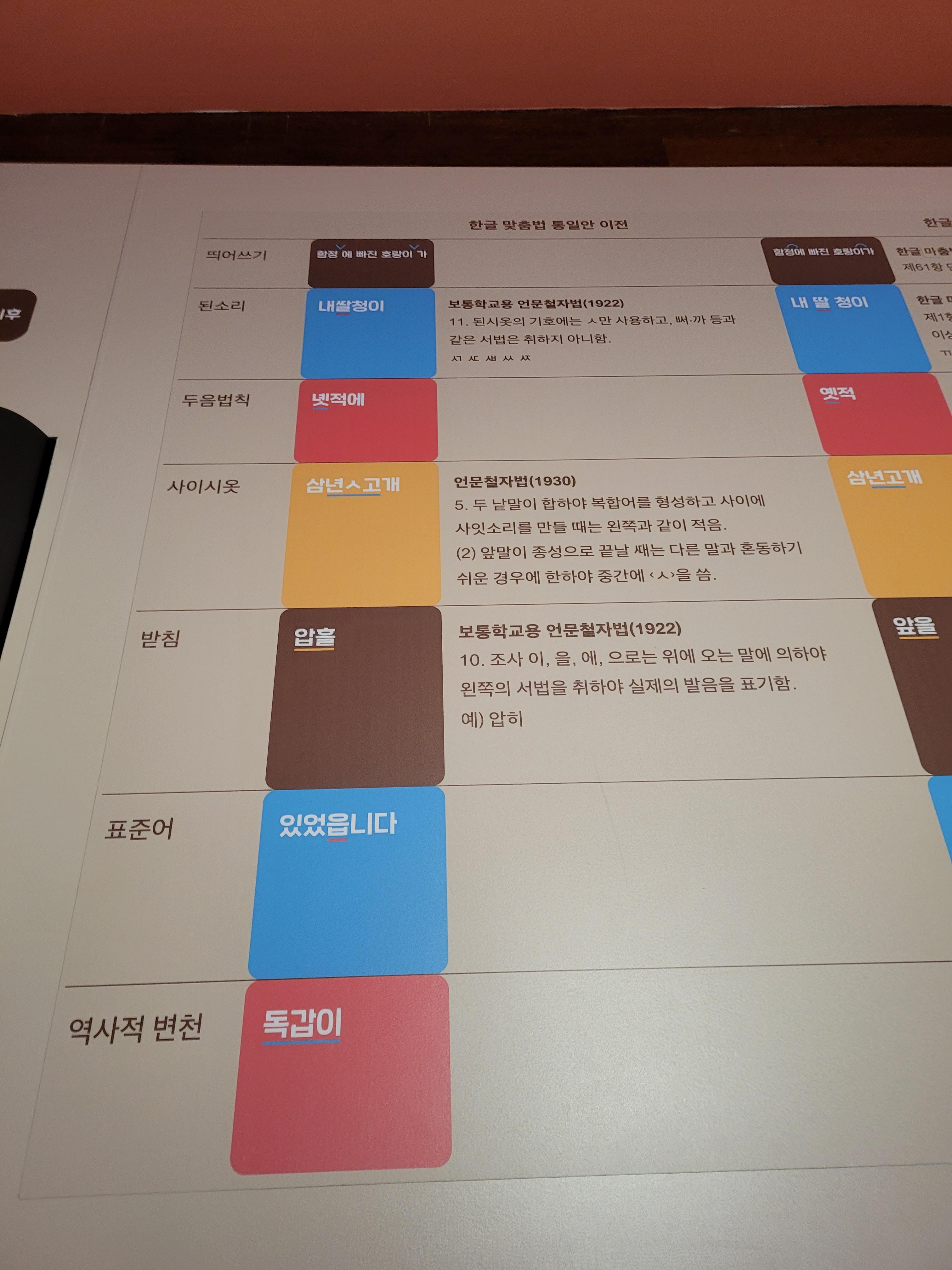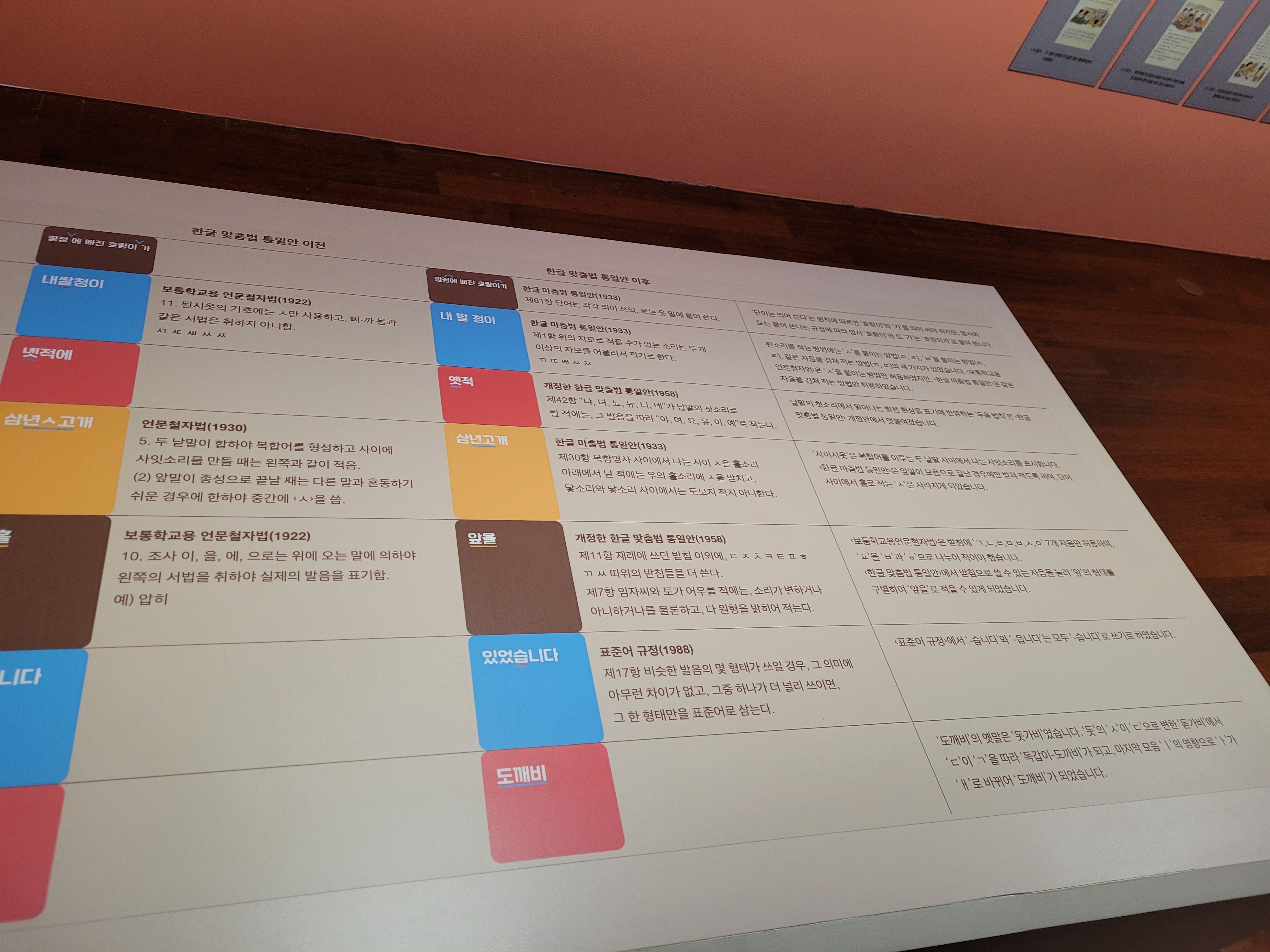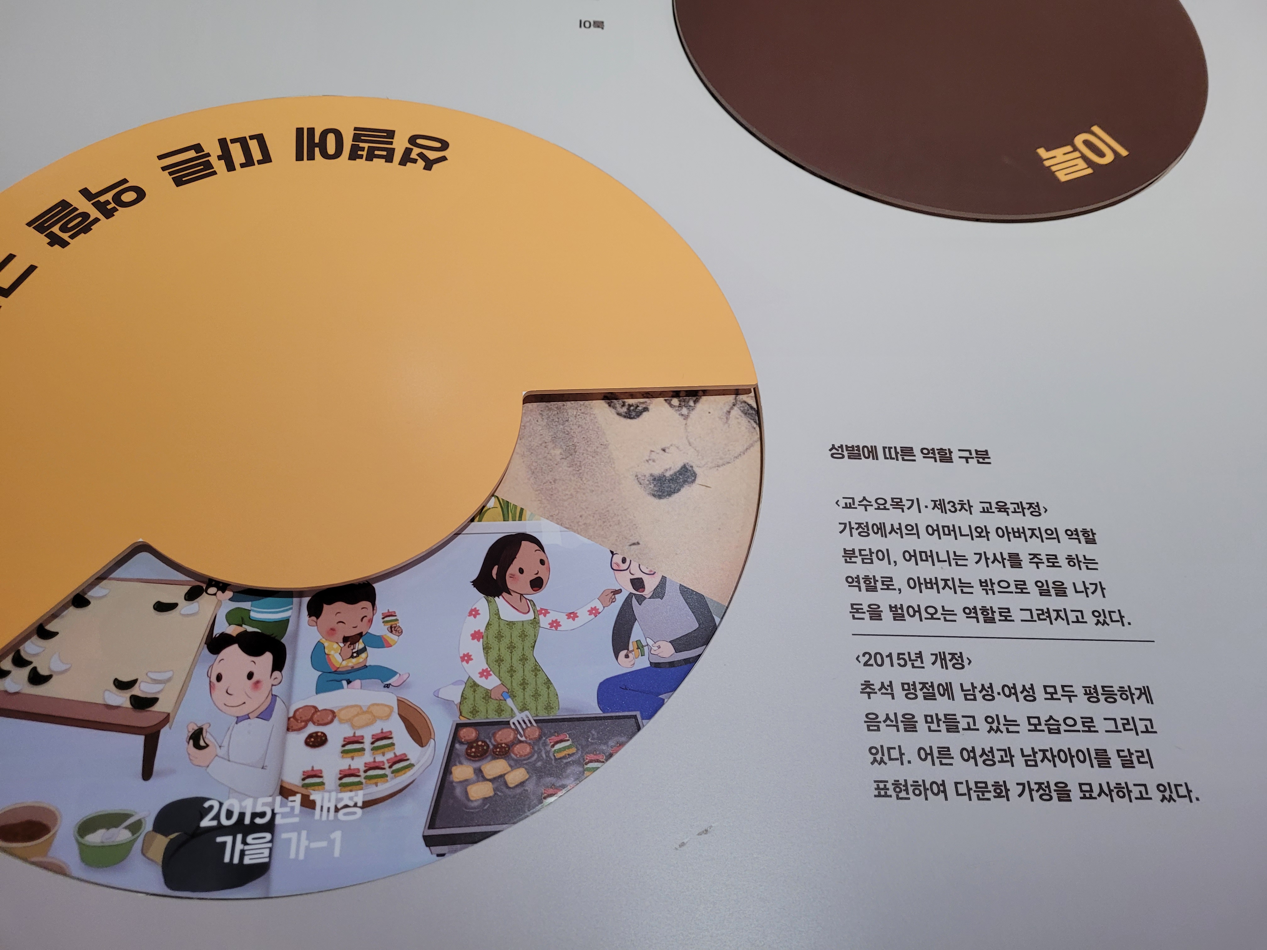 그리고 전시 중간에는 국어 교과서를 통해 확인할 수 있는 한국 문화의 변화와 한글 맞춤법의 변천사 파트가 있었다. 초등학교 교과서... 알고 보면 그 어떤 문서보다 가장 정치적인 것인지도 모른다... 교과서에서 다루는 '내용'은 그 당시 한국 사회에 어떤 문화 코드가 있었는지를 반영한다. 가령 반공 관련 내용이 교과서에 실린 시기가 있었고, 가정에서의 남성과 여성의 역할이 명확히 분리되어 서술되었던 시기가 있었지만 지금은 아닌 것처럼. 또 한글 맞춤법 통일안 전후의 맞춤법 변화도 흥미로웠다. 분명 학부 때 한 번쯤은 배웠을 내용일 텐데 생소한 내용도 있어서 좀 반성했다. 아직 공부가 많이 필요하구나.