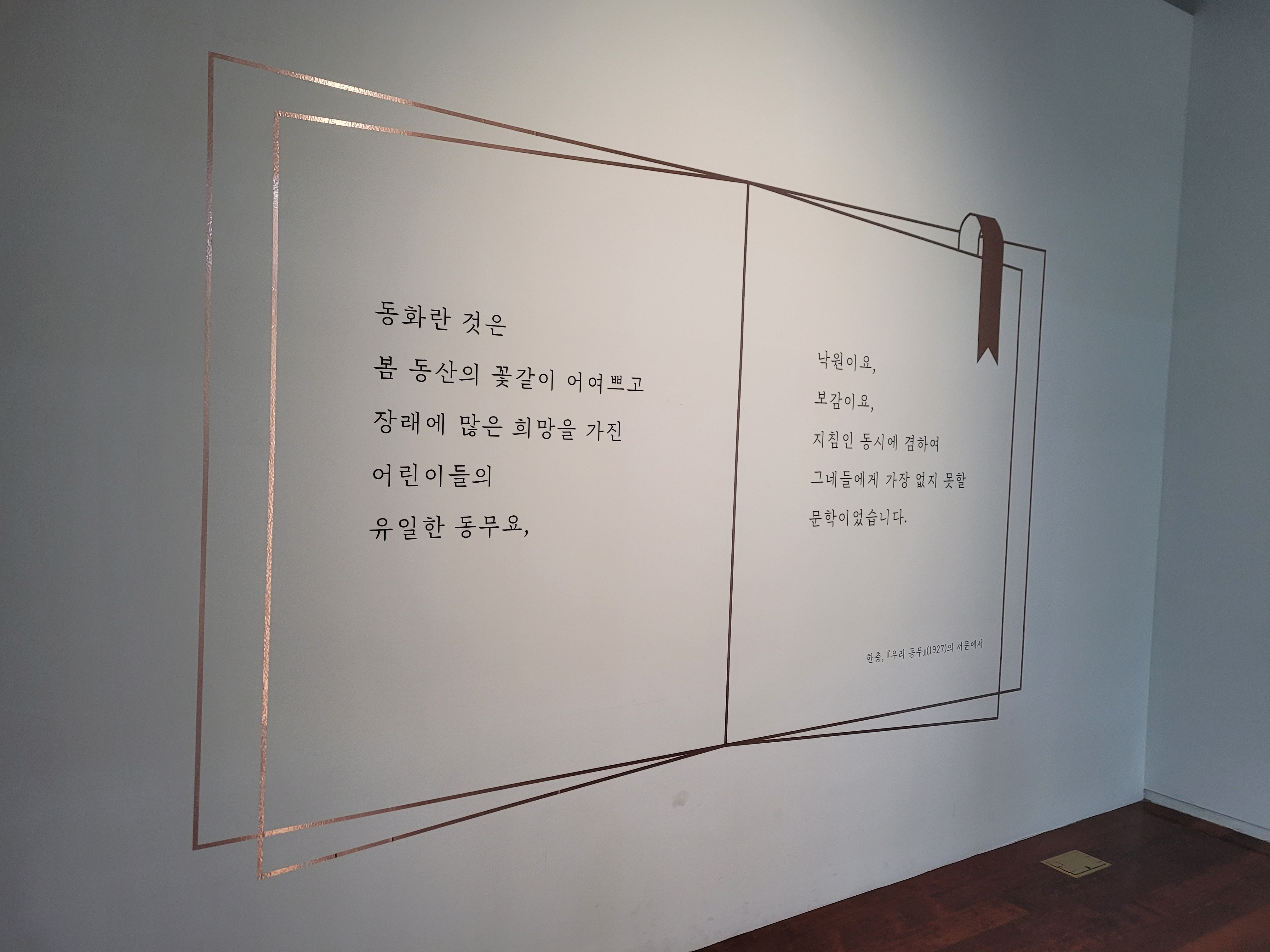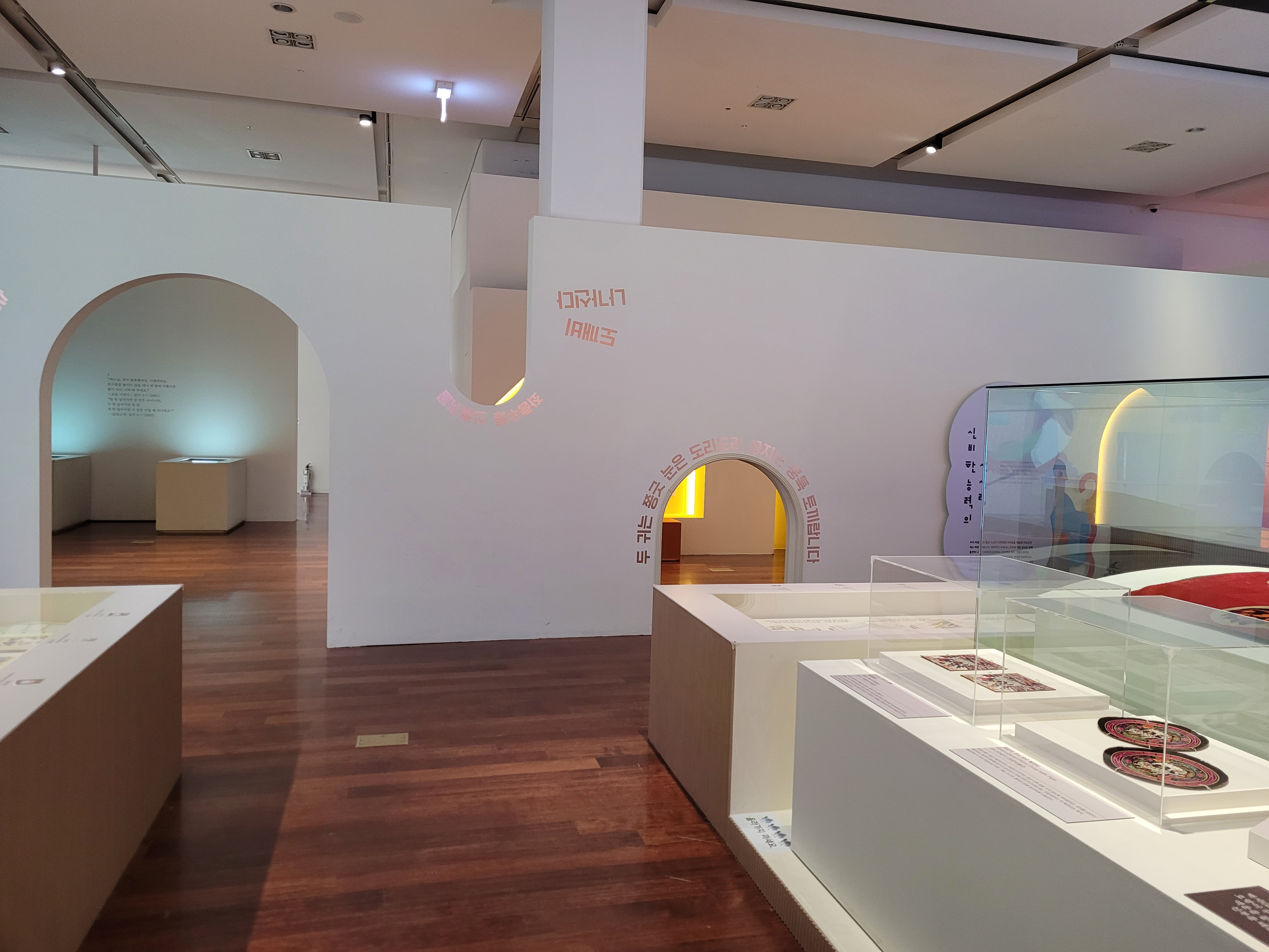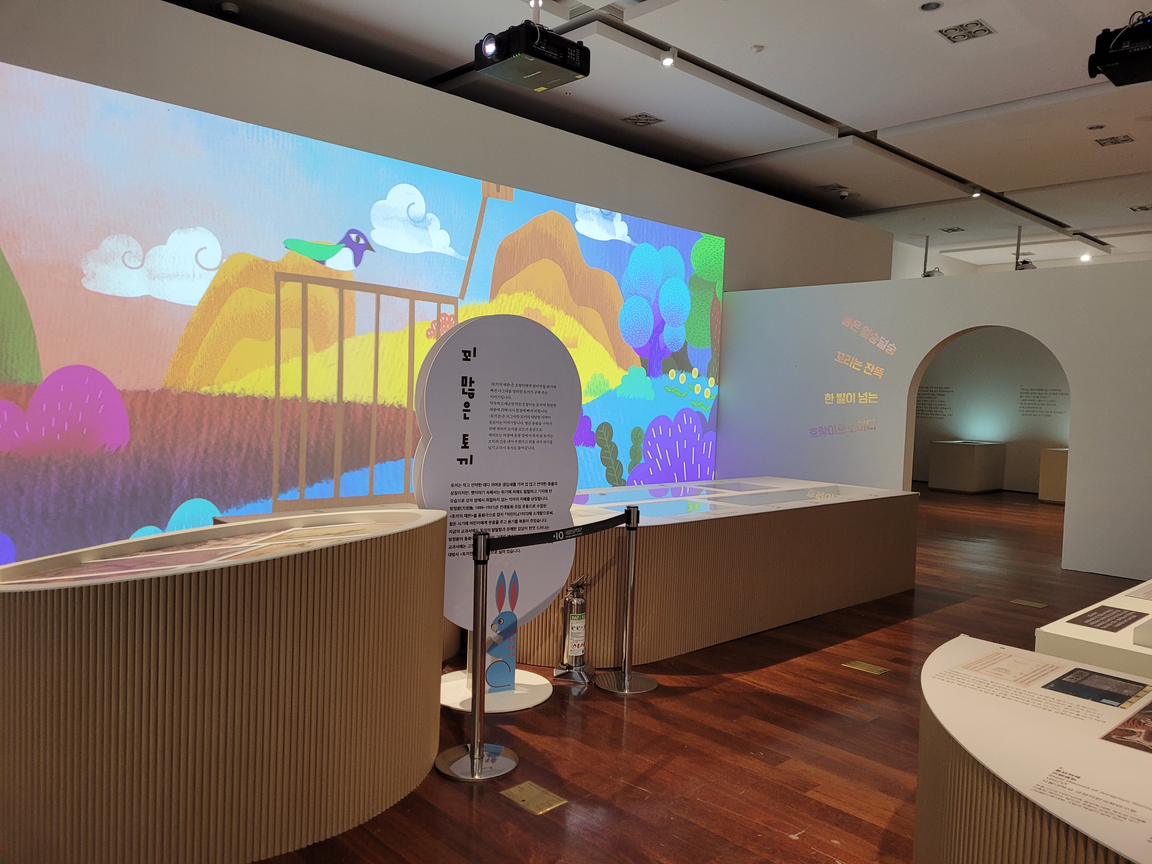 전시물 배치 구도가 흥미로웠던 곳들도 있었고, 벽면에 전시의 길잡이처럼 써둔 글귀들도 하나하나 꼼꼼히 읽었다. 특히 프로젝션을 많이 활용하려고 했던 것 같은데, 나는 공간의 3면을 프로젝션으로 가득 채운 요 공간이 좋았다. 전래동화 책 속에 뛰어든 느낌! 그리고 손으로 책장을 넘기는 모션을 취하면 정말 책장이 넘어가는... 뭔가 인터랙티브한 프로젝션 구간도 있어서 동영상을 찍었는데 티스토리에는 어떻게 업로드하는지 모르겠다. 동영상 업로드 왜 안 돼...? ㅠㅠ (대표 이미지 추출까지만 되고 영상 첨부가 안 되는데 이걸 읽는 누군가가 해결 방법을 아신다면... 알려주면 감사하겠습니다...) 또 손으로 만지고 움직이면서 내용을 확인하도록 하는 전시물도 있어서 아이들이랑 오기도 좋겠다는 생각이 들었다. 이것저것 세련되면서도 친근하게, 그리고 어느 정도의 활동성도 느낄 수 있게 전시가 구성되었다고 느꼈다. 담당자 분들 고생 많으셨습니다...