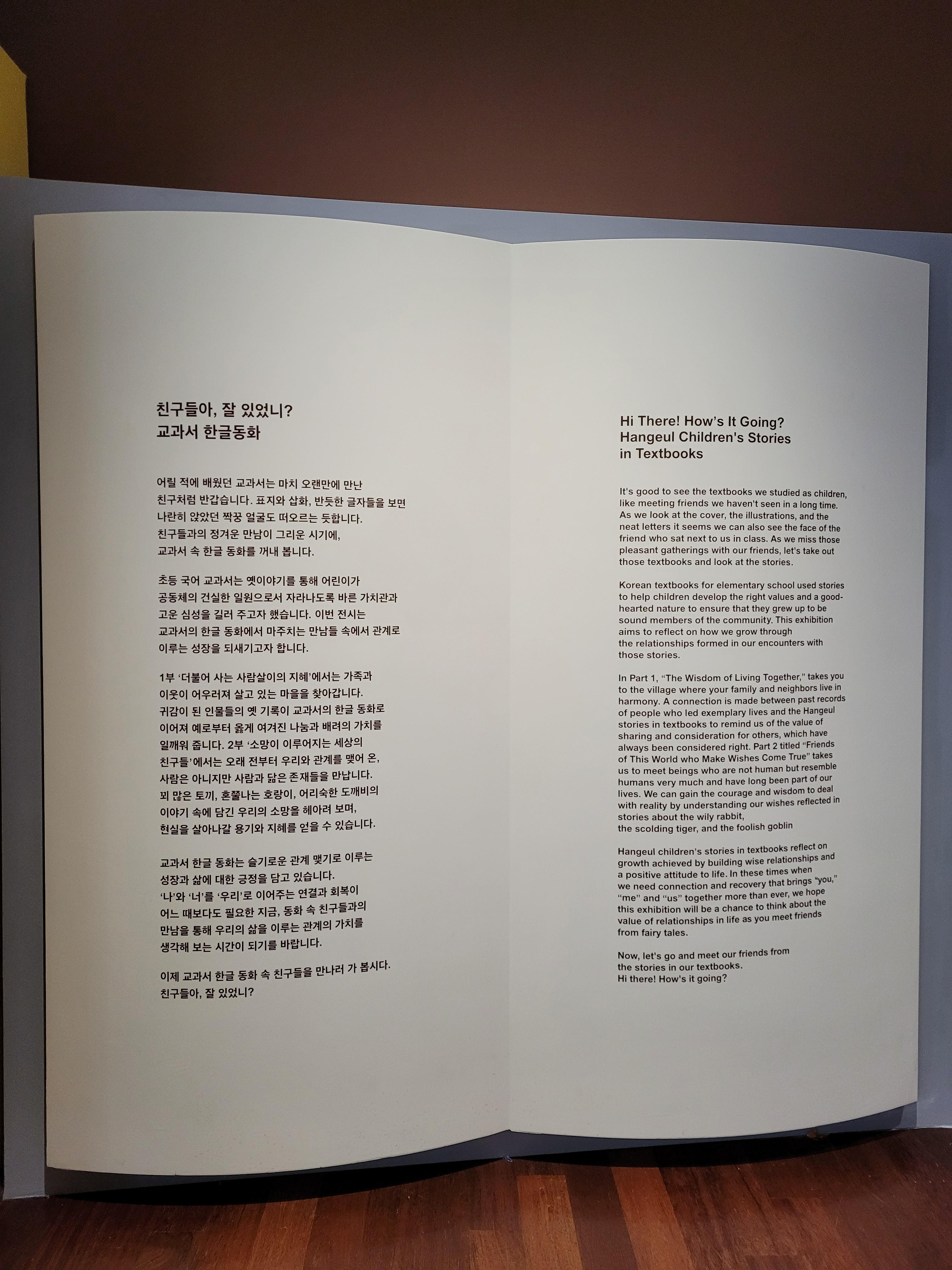 이번 학기에 듣는 수업 중 한국문화론 수업에서는 중간고사 대신 필드워크를 한 번 다녀와야 한다. 발제 같은 조를 맡았던 D 선생님이 나와 성격이 잘 맞았는데, 특히 계획을 미리 세우고 뭐든 빨리 해치워 버리는 걸 좋아한다는 점에서 그랬다. 그래서 D 선생님과 수업이 없는 중간고사 기간에 같이 필드워크를 가기로 했다. 어디를 갈까 고민하다가 한글박물관으로 정했는데, 마침 <친구들아, 잘 있었니?>라는 제목의, 교과서 한글 동화를 주제로 한 기획 전시가 열리고 있었다. (학부생 때 다녀와서 알고 있는 상식: 한글박물관에는 상설 전시와 기획 전시가 있고 기획 전시는 기간을 정해 두고 하는 전시라 시기마다 다르다. 학부생 시절에 갔을 때는 국어정보학 관련 내용의 전시였다.) D 선생님과 함께 발제한 게 한국 문화 중에서도 집단주의, '우리주의'에 관련된 내용이었는데, 동화야말로 늘 그 사회의 중심이 되는 가치관과 금기를 담고 있기 마련이니까 우리 주제와도, 그리고 수업 전체와도 연관될 수 있는 전시가 아닐까 했다.