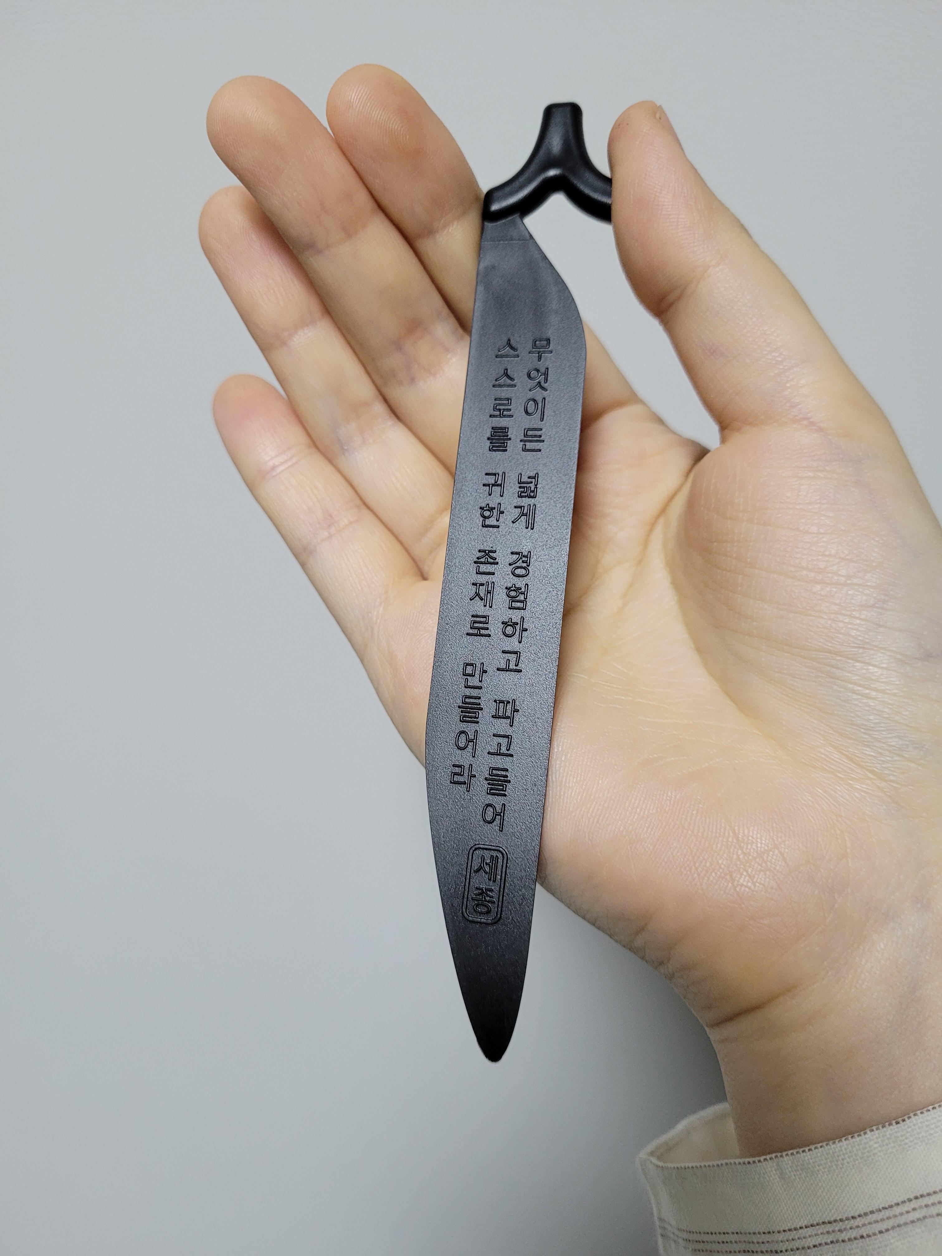 정신없이 수다를 떨고 나서 다시 한글박물관으로 돌아와 굿즈 구경을 신나게 했다. 정말 갈 때마다 눈 돌아가는 굿즈가 많은 곳이다. 선물용으로 마스킹테이프와 샤프를 사고, 내 굿즈로 안경닦이와 책갈피(이자 자 겸 페이퍼나이프 겸 비녀?)를 샀다. 책갈피는 살까 말까 하다 샀는데 뒷면에 새겨진 명언도 너무 마음에 들고(완전 대학원생 맞춤형 명언) 동봉된 한글 설명서가 귀여워서(외국인 겨냥 굿즈였던 것 같다) 포장을 뜯고 나서 더 만족했다. ㅅ을 산 것은 역시 내 이름의 첫 자가 ㅅ이니까! 약 6년 전 한글박물관에 갔을 때에도 ㅅ을 테마로 표지가 꾸며진 노트를 샀었다. 공연 관람 후기 노트로 쓰고 있었는데 이젠 공연 볼 일이 많이 없어졌지만... 괜히 애틋하게 생각이 나서 집에 와서 그 노트도 꺼내 보았다.