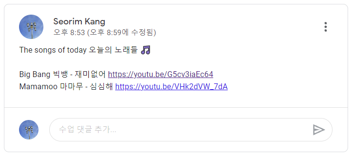 오늘은 '어려워요'를 알려주다가 한 학생이 '힘들어요'는 어떻게 다르냐고 물어봐서 설명해 줬다. 그걸 설명해 주고 나자 누군가가 갑자기 'boring'은 어떻게 말하냐고 물어봐서 '지루해요'와 '재미없어요'를 알려 줬고, 그러자 '심심해요'는 또 뭐가 다르냐는 질문이 날아왔다. 이런 질문들을 받고 고민하는 과정에서 나의 한국어에 대한 감각이 벼려지는 것 같다. 이것도 어떻게 설명했는지 기록으로 남겨 보자면, '힘들어요'는 어떤 burden이 생겨서 그것이 나의 힘(strength)을 쓰게 만들고 그래서 어렵고 지치게 만드는 것이라고 알려 줬다. '재미없어요'는 다들 이미 뜻을 알고 있었으니 넘기고, '지루해요'는 뭔가 하는 일이 있는데 그게 지금 boring하고 not interesting한 것이고, '심심해요'는 할 것이 아무것도 없어서 boring한 거라고 말해 줬다. 근데 사실 아무런 특별한 일이 없을 때 '지루하다'도 쓰긴 쓰니까 아주 정확한 설명이 아니라는 걸 인지하면서도... 더 좋은 설명을 찾을 수가 없었다. (언젠가 이 글을 읽는 누군가에게 더 좋은 아이디어가 있다면 꼭 알려주길 바람...) 아무튼 '재미없어요'를 물어본 학생은 빅뱅의 '재미없어'라는 노래를 알고 있다며 링크를 줬고, '심심해요'를 물어본 학생은 마마무의 '심심해요' 노래를 듣고 궁금해져서 물어봤다고 해서 내가 링크를 찾아 반에 공유했다. 구글 클래스룸에도 링크를 올렸다. 정말이지 매번 긴장을 놓칠 수 없는 수업들.